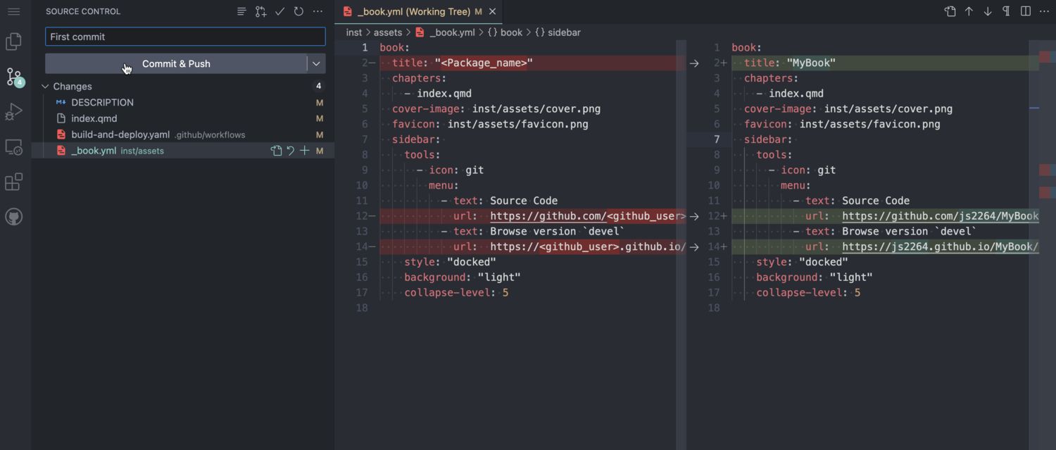 Once you are done writing pages of your new book, you should always commit your changes and push them to Github. This can be done as follows: