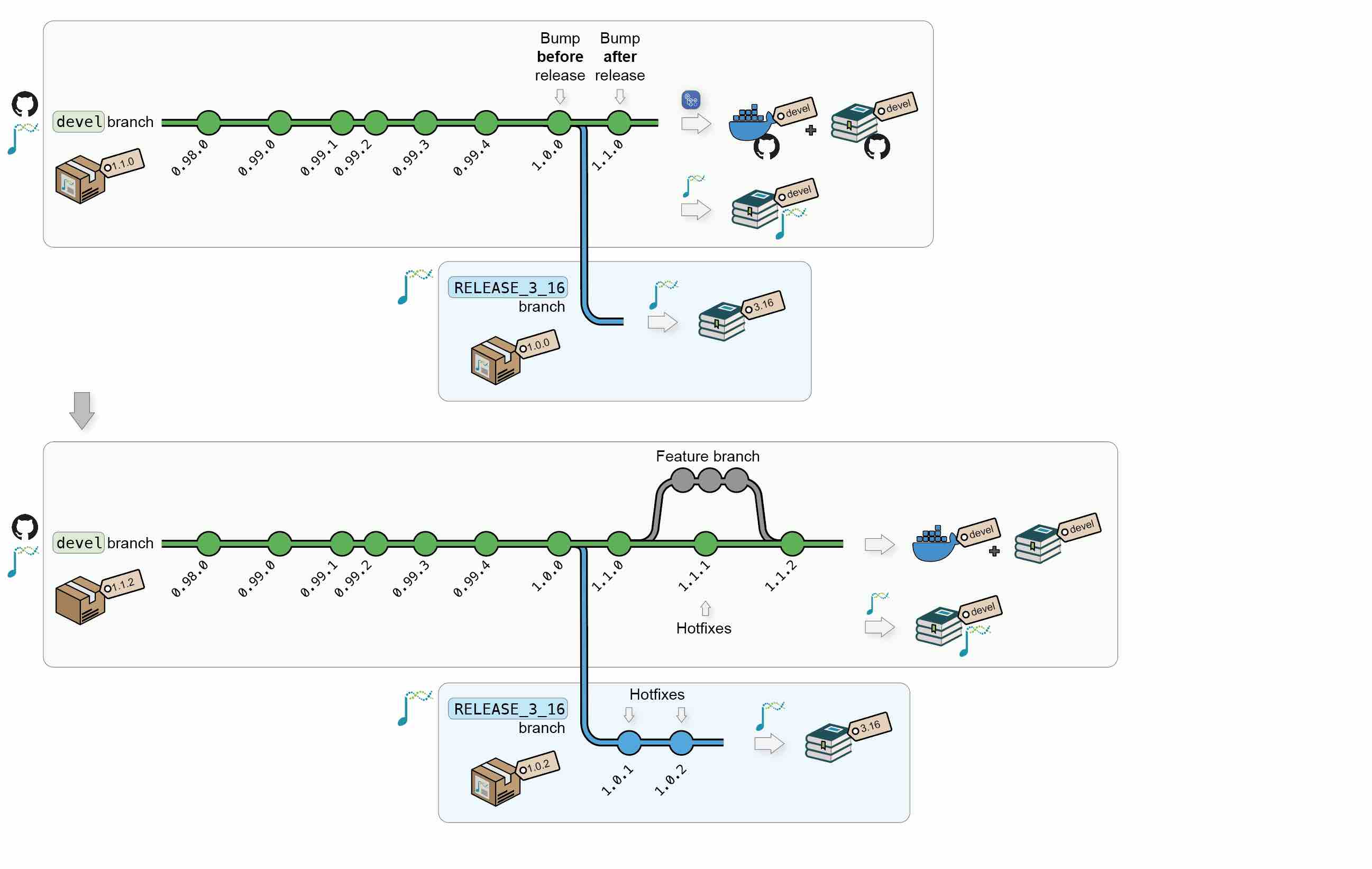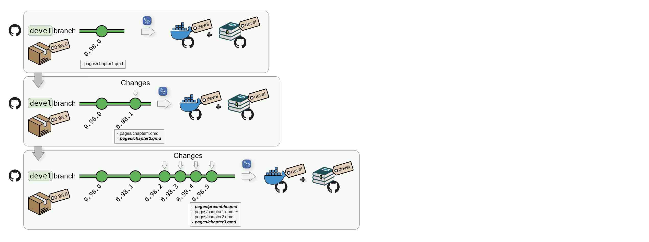 After new releases, updates and/or hot fixes can still made, both on the latest Bioconductor release and on the devel branch. New commits will automatically trigger the regeneration of the Docker image and the online book for the modified branch(es).