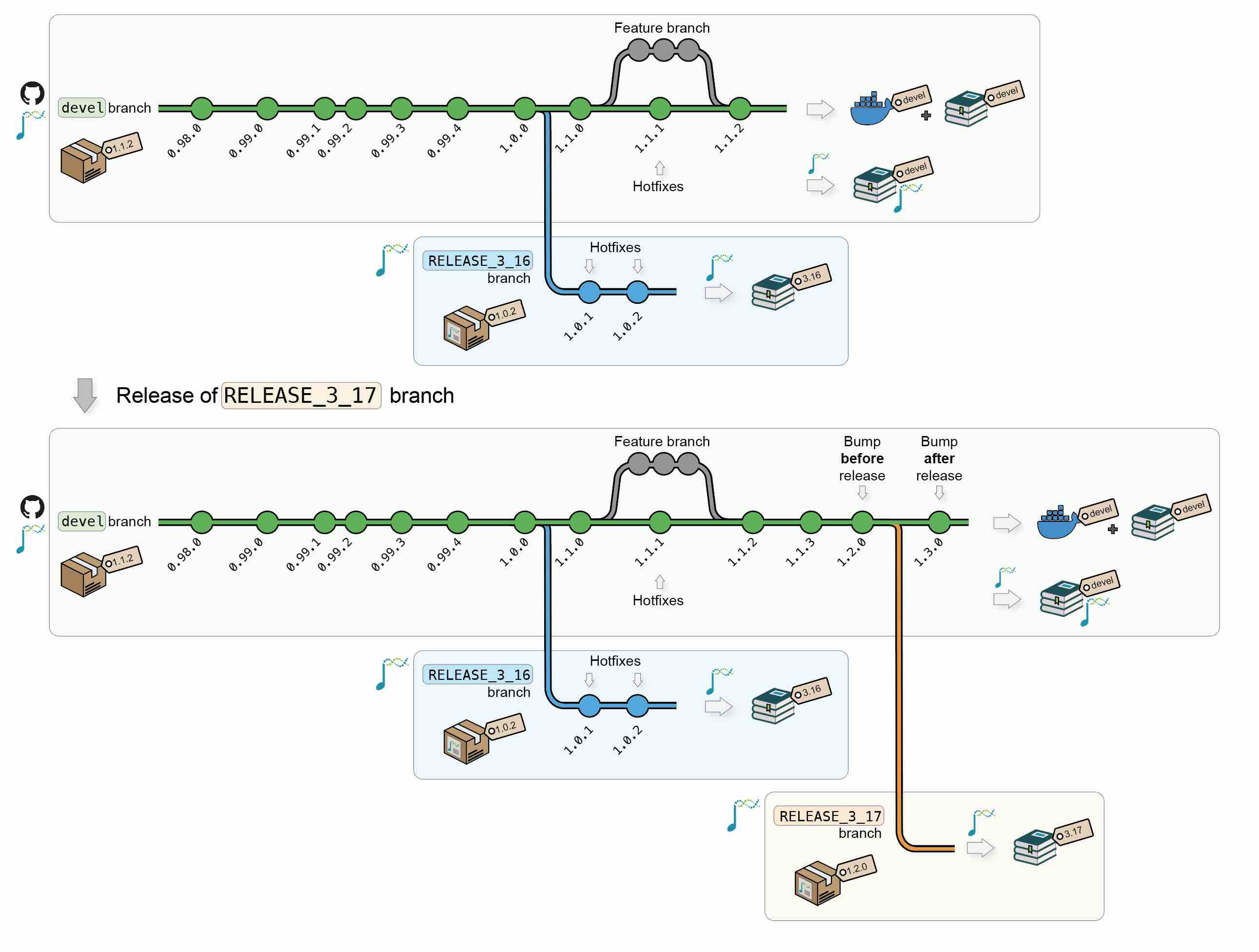 develDocker image and the online bookdevelversion; - Regularly, the author bumps versions and push to Bioconductor’s