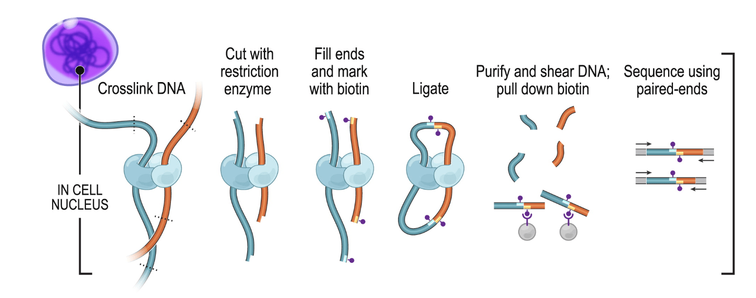 In Hi-C, chromatin is crosslinked within intact nuclei and enzymatically digested (usually with one or several restriction enzymes, but Hi-C variants using MNase or DNase exist). End-repair introduces biotinylated dNTPs and is followed by religation, which generates chimeric DNA fragments consisting of genomic loci originally lying in spatial proximity, usually crosslinked to a shared protein complex. After religation, DNA fragments are sheared, biotin-containing fragments are pulled-down and converted into a sequencing library.