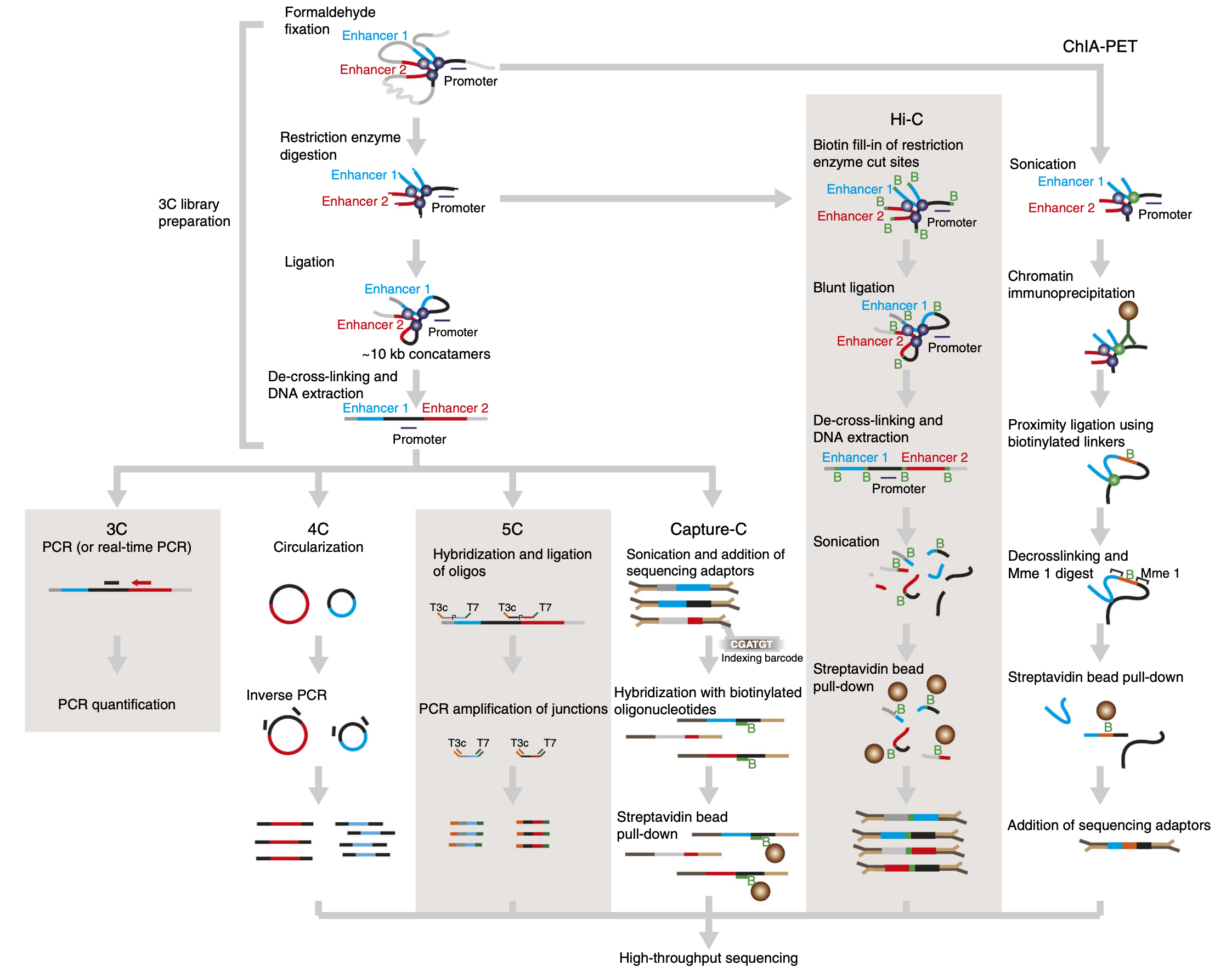 A number of C variants have been proposed since the publication of the original 3C method (reviewed by Davies et al. (2017)), the main ones being Capture-C and ChIA-PET (see procedure below).