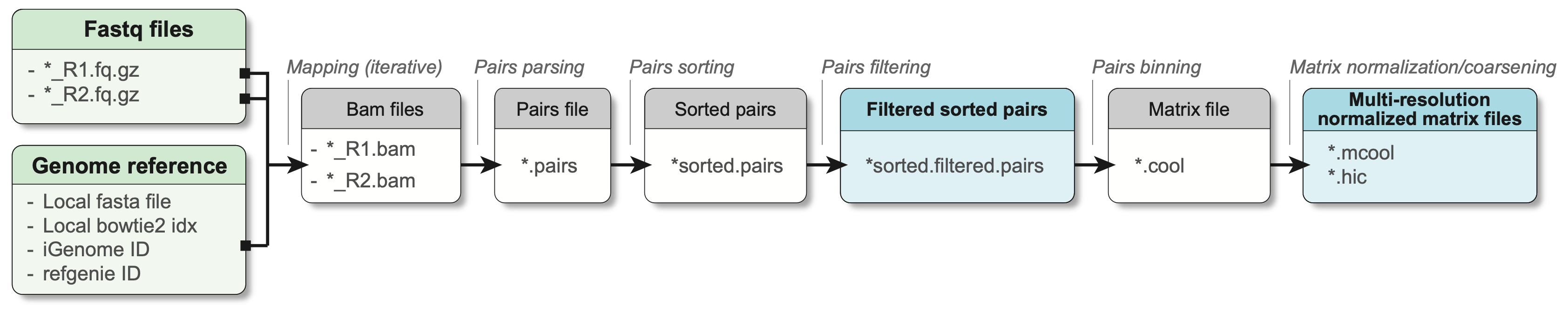 Hi-C libraries are traditionally sequenced with short-read technology, and are by essence paired-end libraries. For this reason, the end result of the experimental side of the Hi-C consists of two fastq files, each one containing sequences for one extremity of the DNA fragments purified during Hi-C. These are the two files we need to move on to the computational side of Hi-C.